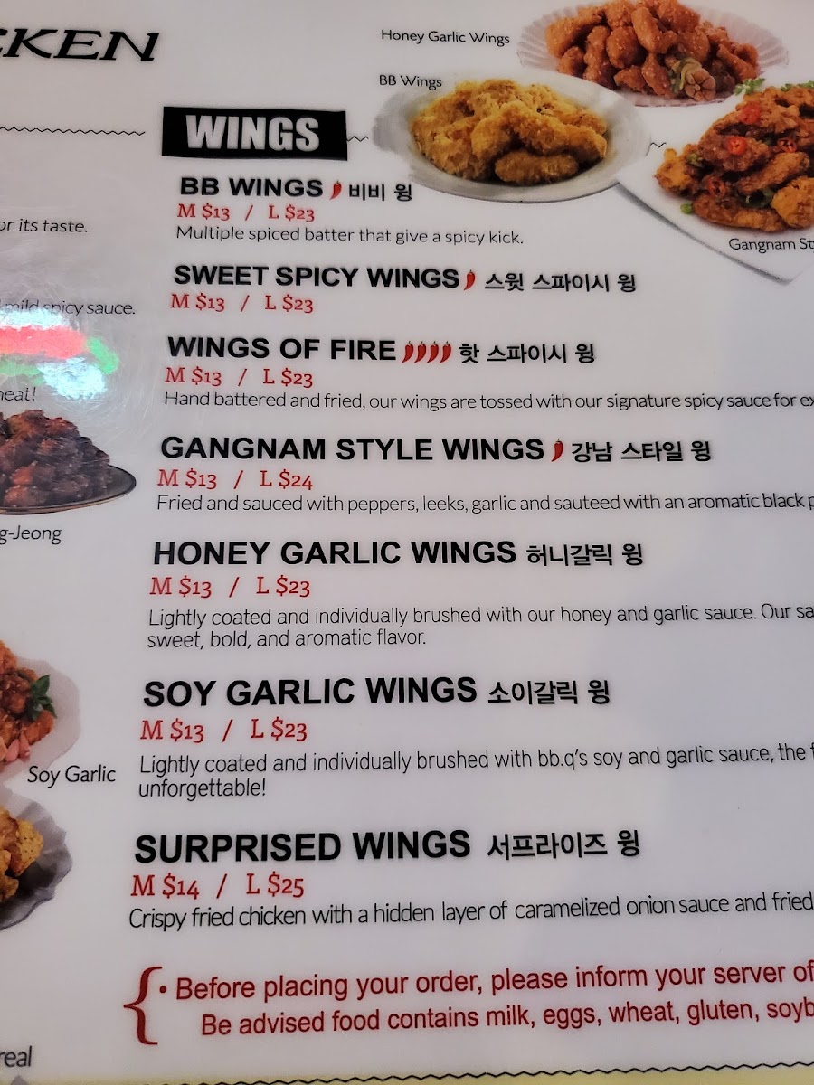“ Me and my bf went to have this delicious chicken. We ordered nine PCs of garlic honey wings and 9pcs of soy garlic with a side of sweet potato fries everything was delicious.It wasn't busy two small groups at a time so the waiters were very attentive.I would definitely come back here again. Total came out to around $41 ”